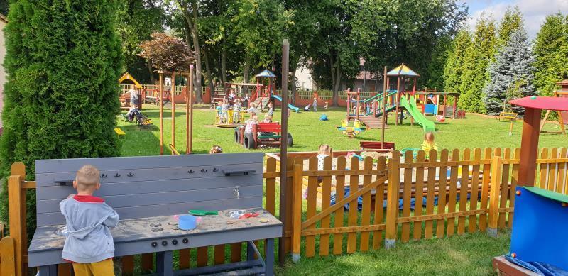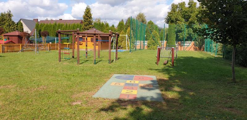 - duży plac zabaw wyposażony w bezpieczne i atrakcyjne dla dzieci zabawki ogrodowe oraz wydzielone strefy: boisko sportowe, trampolinę naziemną, linowa piramida do wspinania i kuchnię błotną, a także innowację pedagogiczną (SKANSEN),
